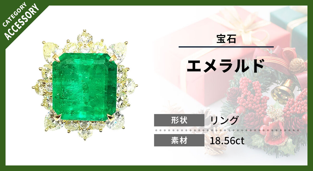 今回のお品物は、18.56ct もの大粒エメラルドを主石に据え、